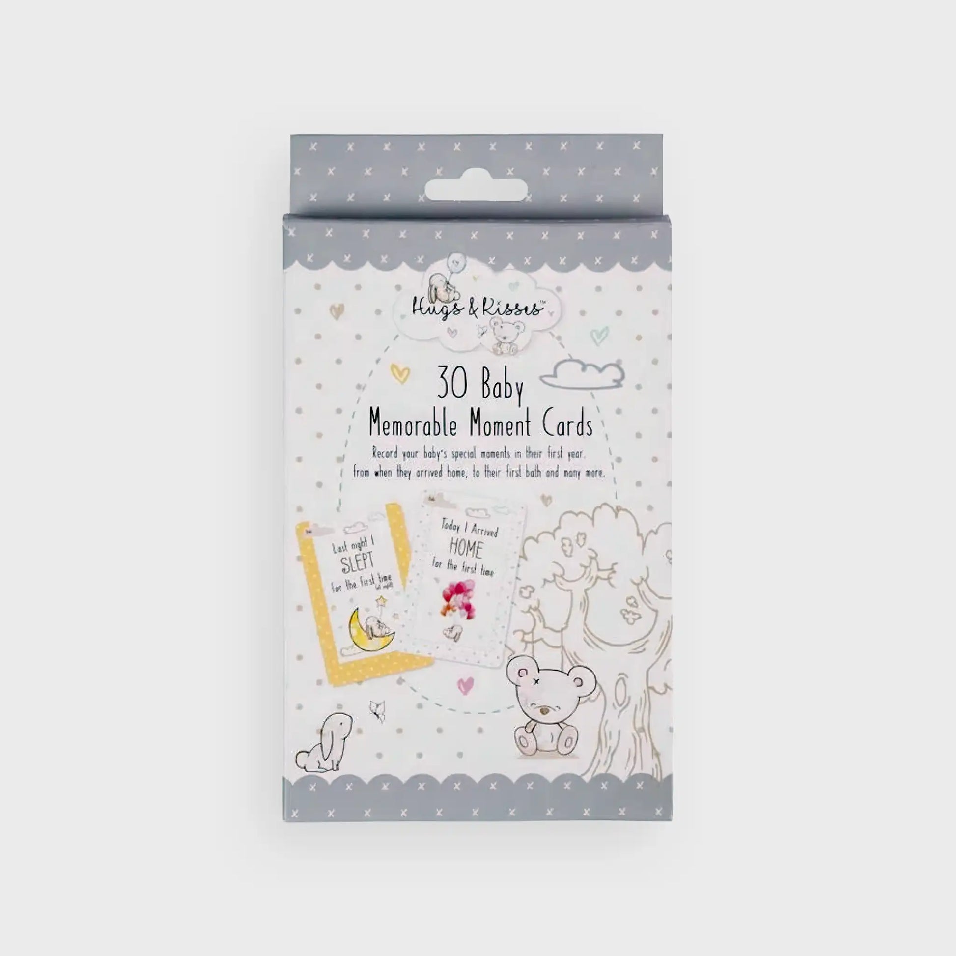 Capture your little one's special milestones with the Hugs & Kisses 30 Memorable Moments Cards. This beautifully designed set includes 30 high-quality cards printed on sturdy 350gsm card, perfect for photographing and recording precious firsts—from first smiles to first steps. With a soft and timeless design, each card measures approximately 17cm x 11cm, offering plenty of space to write memorable dates and details. Ideal for baby boys and girls, these keepsake cards make a thoughtful gift for new parents.