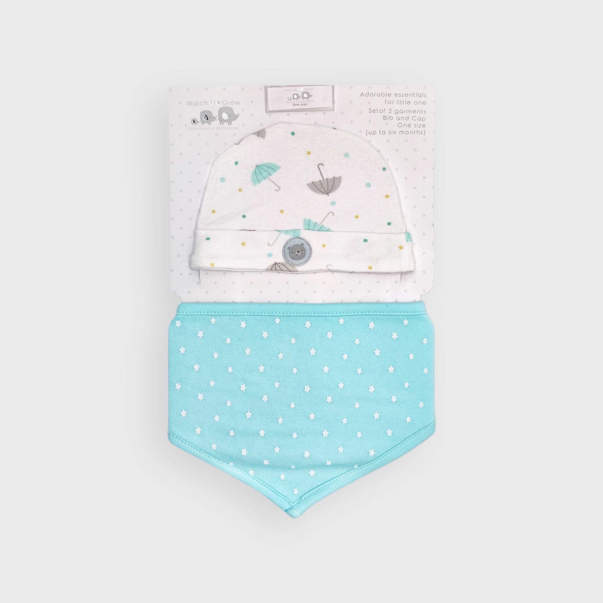 Bring a splash of charm to your baby's daily essentials with the Watch Me Grow Hat & Bib Set. The soft white layette hat features an all-over umbrella print and a turned-up brim complete with an adorable bear badge, crafted from 100% cotton jersey for ultimate comfort, these hats are not only soft but comfortable around baby's head. Paired with a cyan bandana-style bib decorated with a playful star print and a secure Velcro fastening, these bibs are super soft for your baby's skin. This set is as functional as it is delightful. Suitable for baby boys and girls, it’s a lovely unisex addition to any little wardrobe.