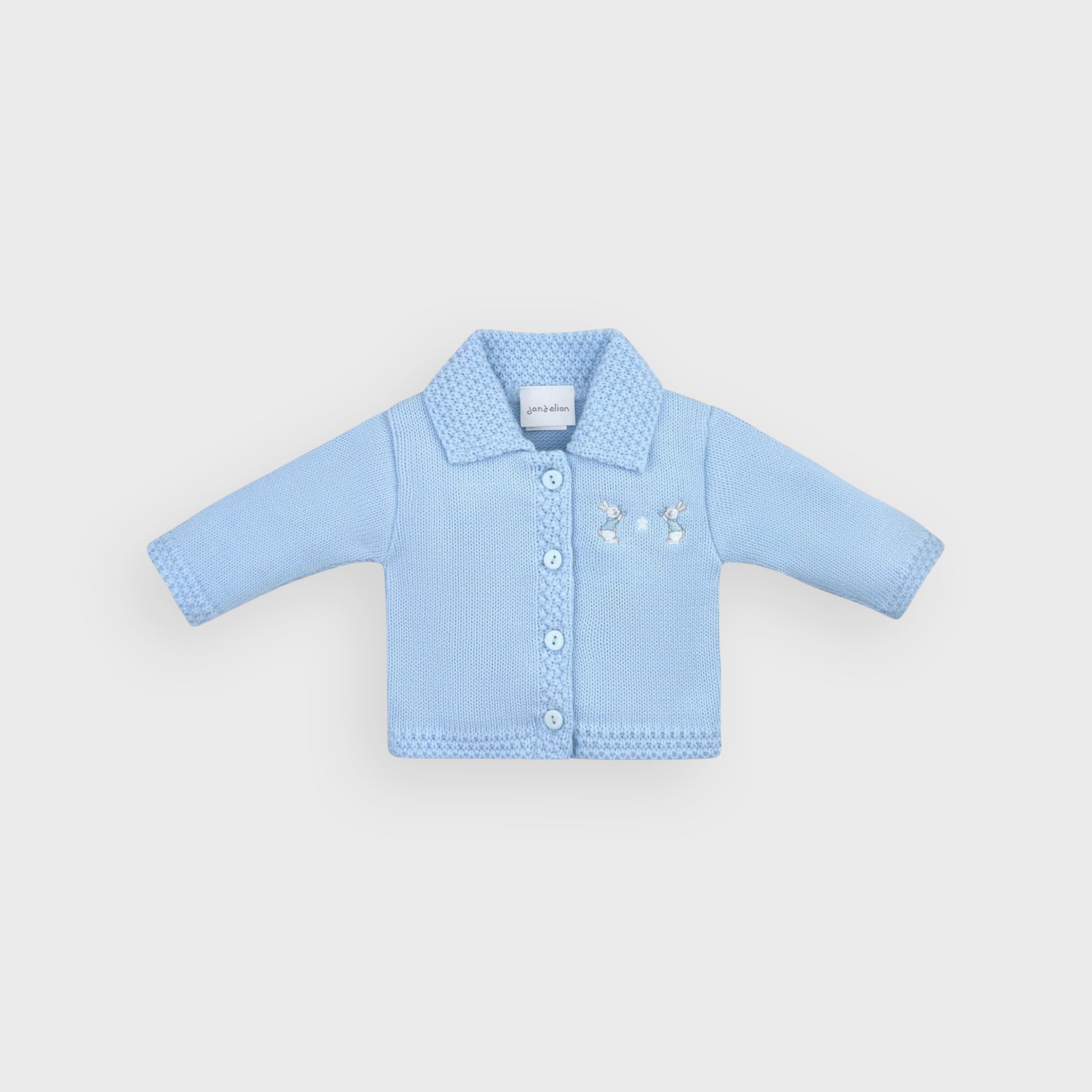 Wrap your little one in classic charm with the Dandelion Knitted Bunny Cardigan in soft blue. Made in Portugal from high-quality 100% acrylic, this premium knitwear piece offers both comfort and elegance. The cardigan features a smart collar, four-button fastening, and beautifully embroidered bunny details for a touch of timeless sweetness. Perfect for layering, it’s an ideal choice for special occasions or everyday wear, bringing warmth and style to any baby boy's wardrobe.