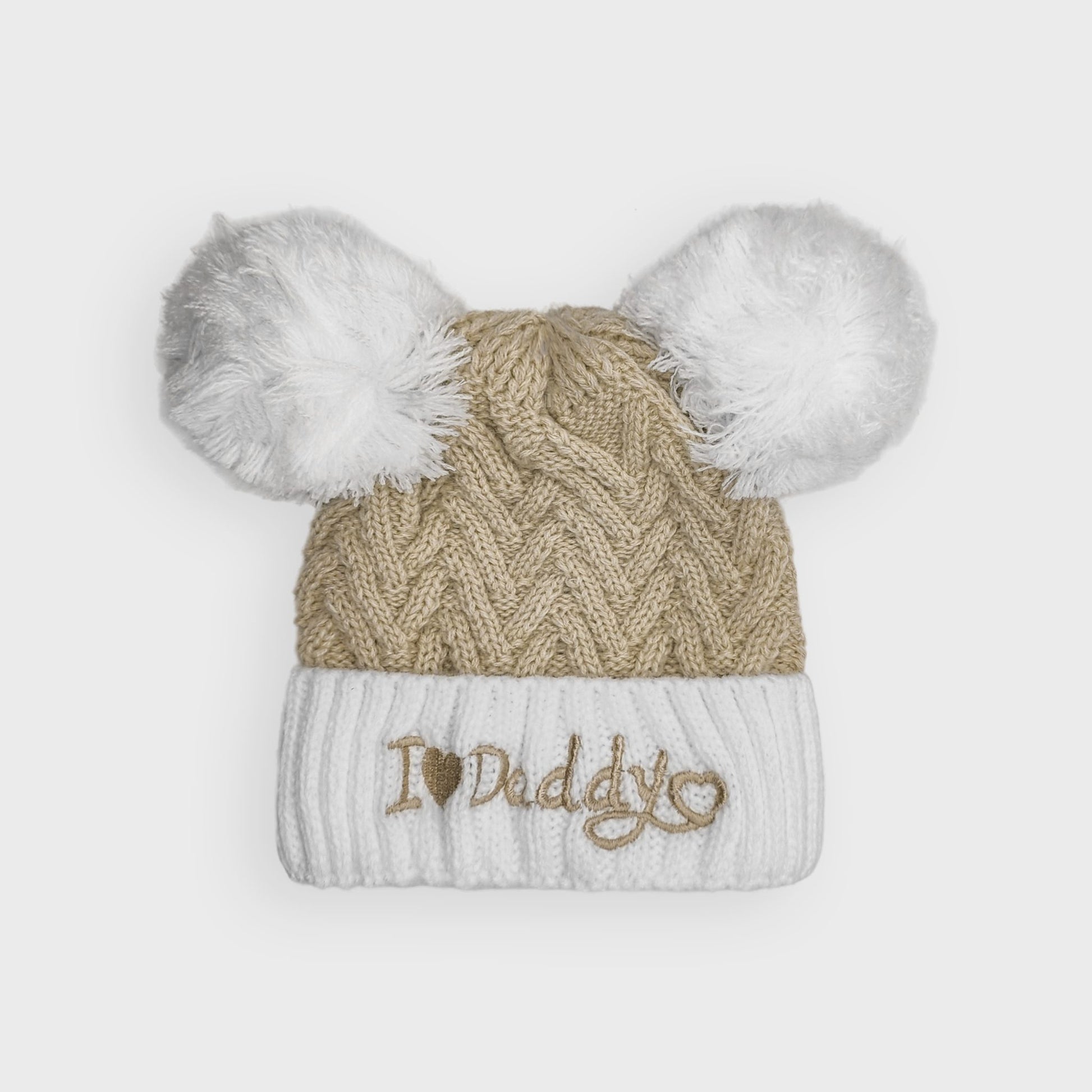 Celebrate special moments with the Soft Touch "I Love Daddy" Chevron Double Pom Hat in adorable coffee and white. This cosy hat features a charming chevron knit design, two fluffy white pom poms, and a soft turned-up white brim embroidered with "I Love Daddy" in matching coffee. Made from 100% acrylic, it’s gentle on delicate skin while keeping your baby boy warm and stylish. Perfect for gifting or everyday wear, it’s a heart-warming accessory full of love.