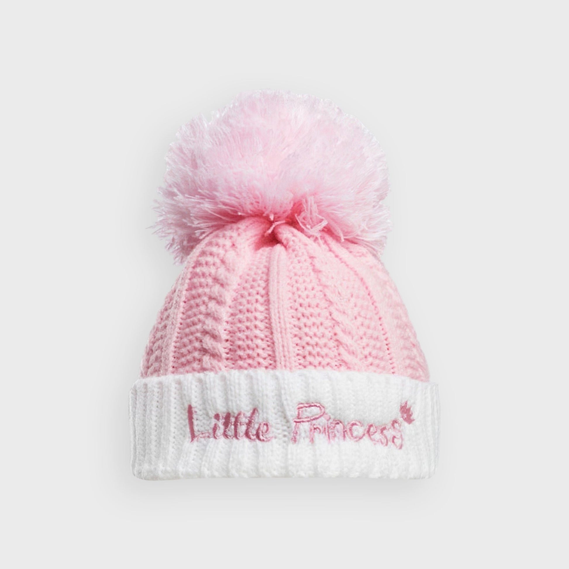 Let your little one shine in royal style with the Soft Touch "Little Princess" Cable Knit Pom Hat in soft pink and white. This adorable hat features a classic cable knit design, a single fluffy pink pom pom on top, and a cosy pink body with a white turned-up brim. Embroidered with "Little Princess" in delicate pink stitching, it adds a sweet and regal touch to any outfit. Made from 100% acrylic, it’s warm, soft, and gentle on delicate skin—perfect for keeping baby girls snug and stylish.
