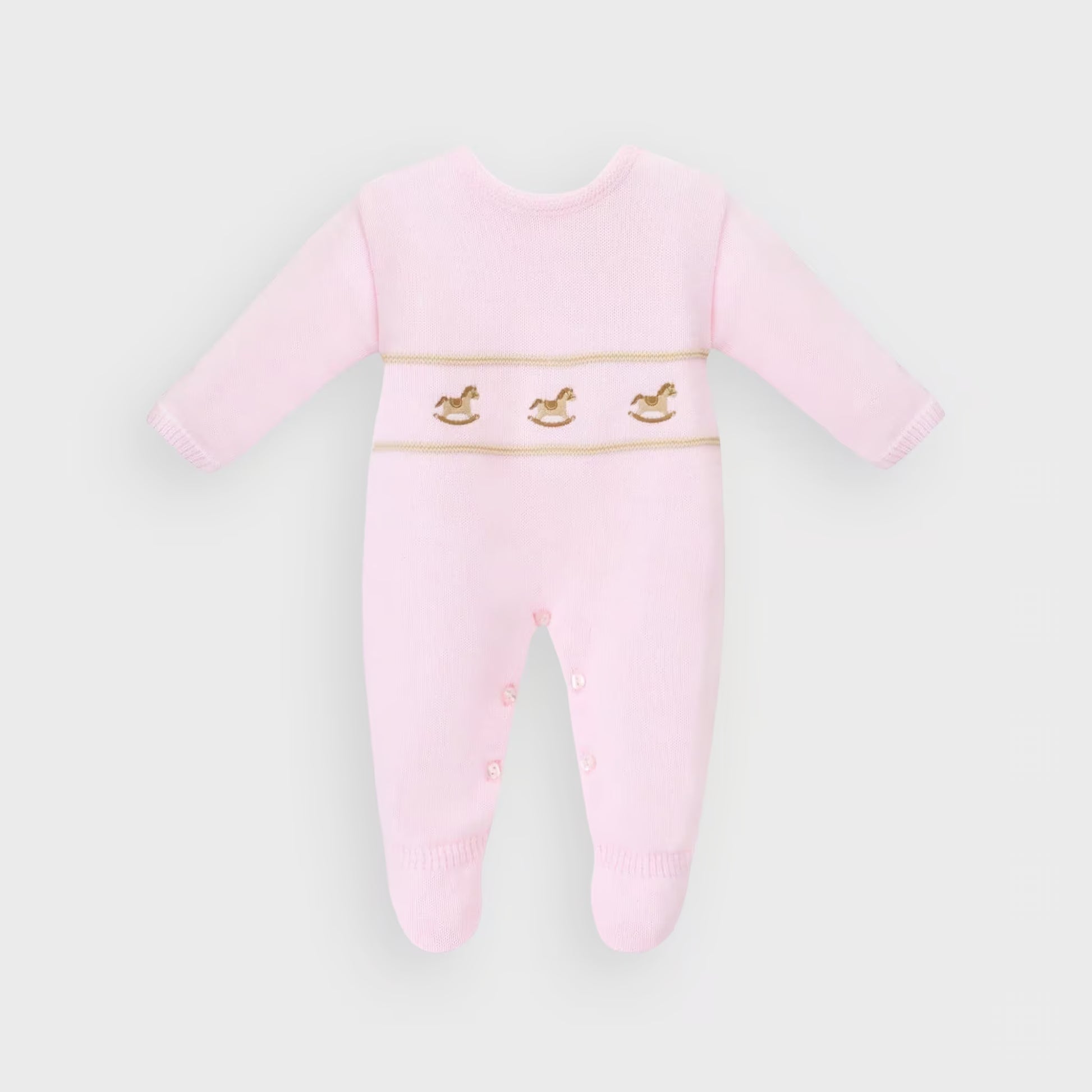Dress your baby girl in classic elegance with the Dandelion Rocking Horse Knitted Onesie in soft pink. This beautifully made premium onesie features a charming row of three knitted rocking horse appliques across the front—bringing timeless appeal to your little one’s wardrobe. Crafted in Portugal from soft 100% acrylic, it offers warmth and comfort while remaining gentle on delicate skin. The full button fastening down the back ensures easy dressing, making it both practical and adorable.