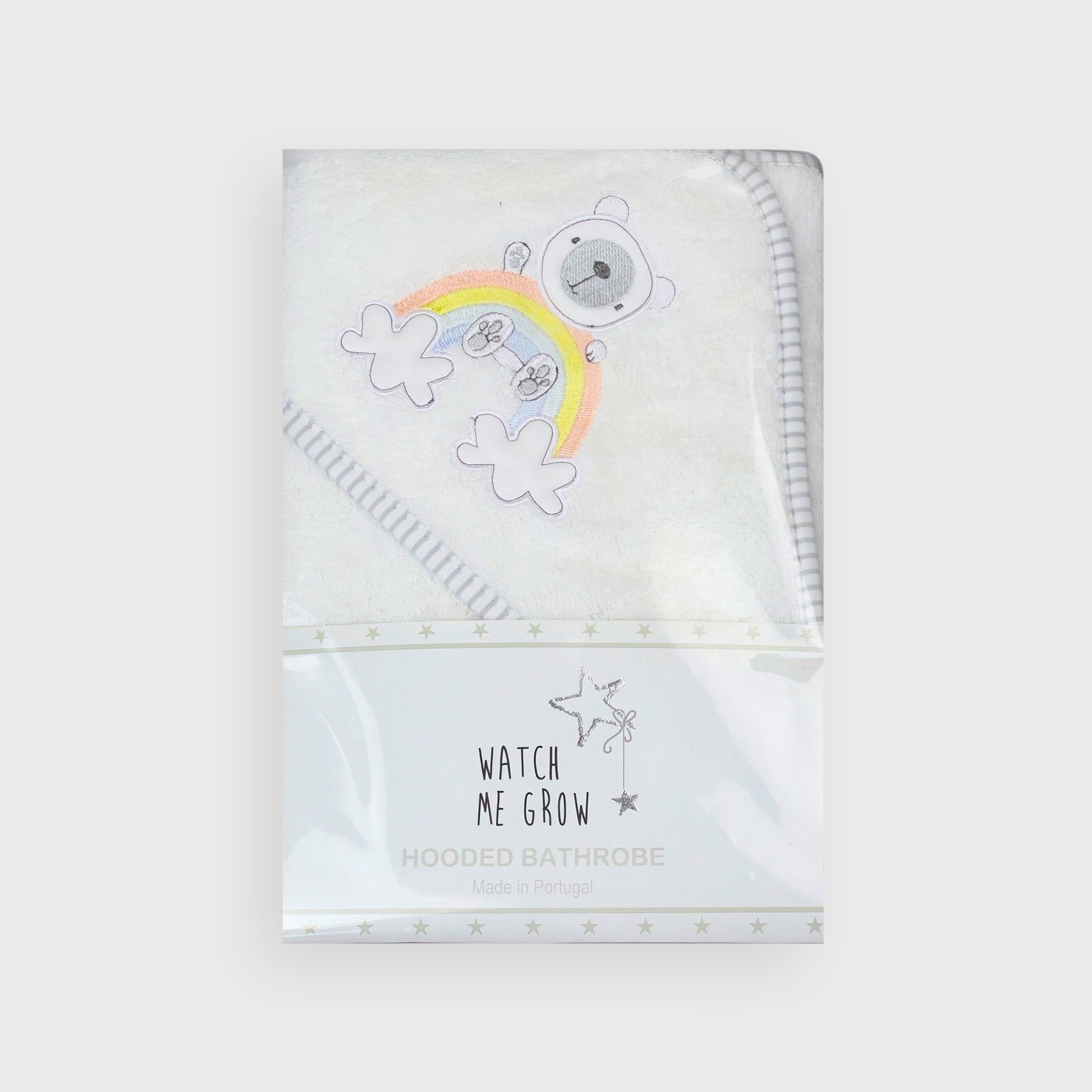 Make bath time extra special with the Watch Me Grow Rainbow Hooded Towel. Crafted from 100% soft cotton, this cosy white towel features an embroidered hood with an adorable bear sitting on a rainbow, bringing a playful and comforting touch to your little one's routine. The towel is finished with a stylish white and grey striped trim and perfectly sized at 70 × 70 cm to wrap your baby snugly after a bath. Suitable for boys and girls, it’s the perfect blend of comfort, charm, and practicality.