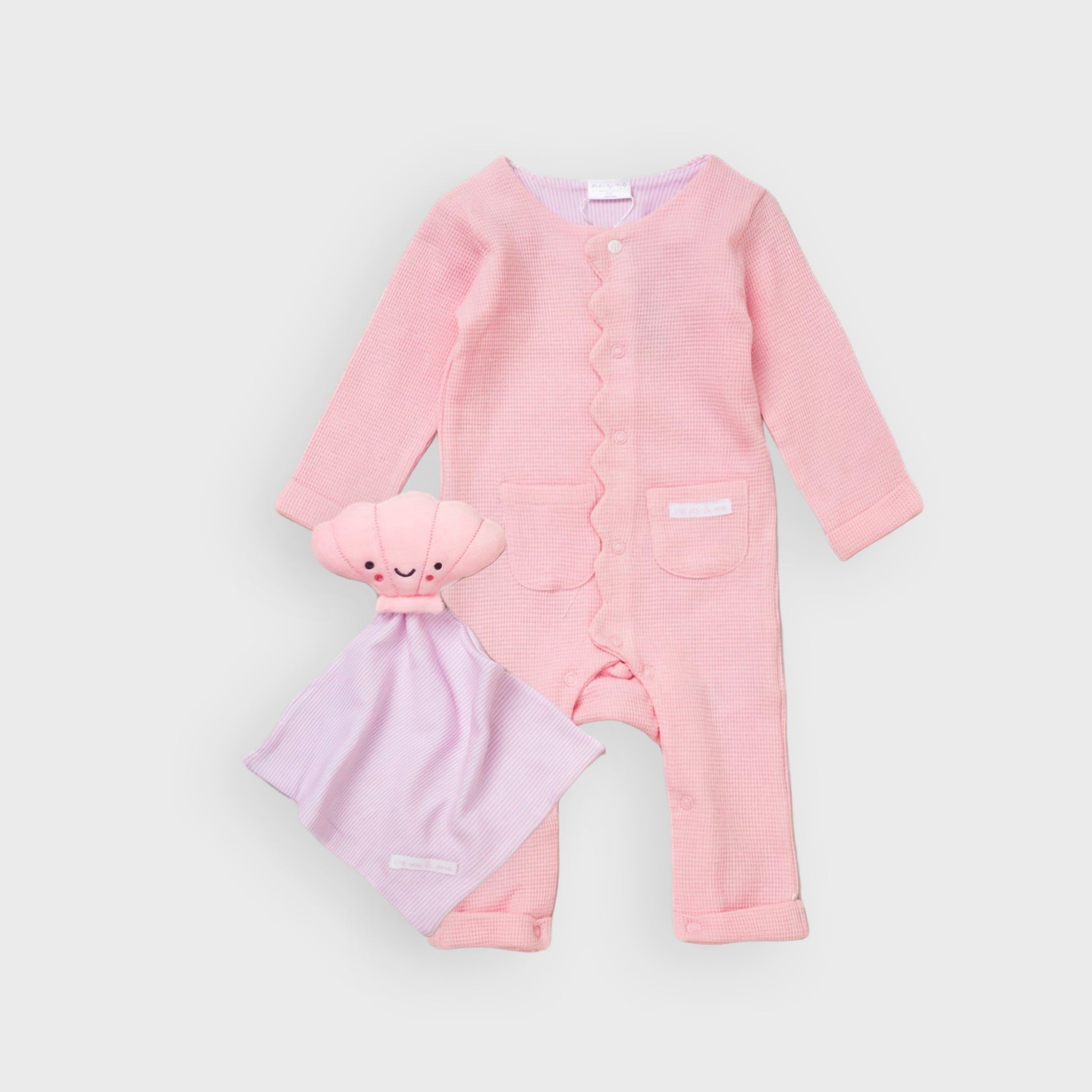 Give your baby girl a gentle and stylish start with the Rock-a-Bye Baby Waffle Fabric All In One & Shell Comforter Set in soft pink. The all-in-one is made from 100% cotton waffle fabric, offering a breathable, cosy fit with a delicate texture that’s kind to sensitive skin. Paired with a sweet shell-shaped comforter featuring a plush inner and soft polyester reverse, this set provides both comfort and cuddly companionship, making it a perfect choice for naps, playtime, or gifting.
