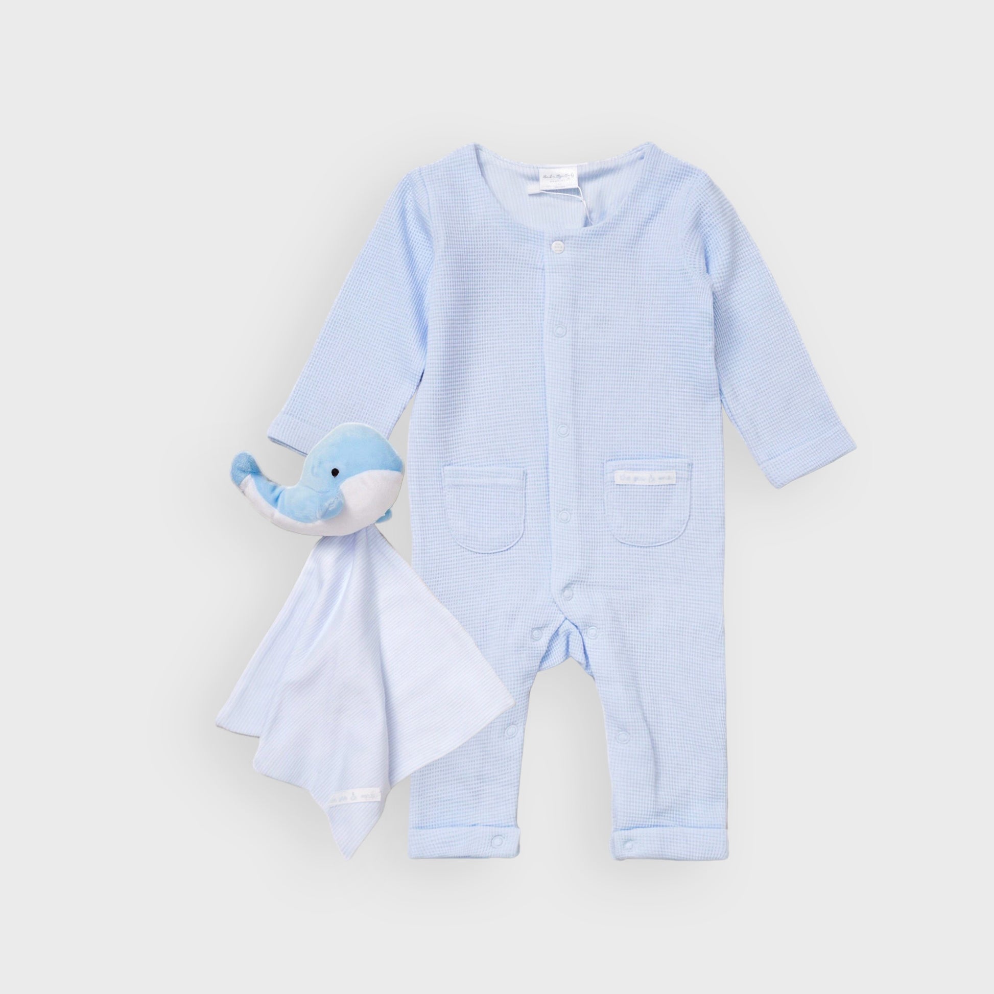 Wrap your baby boy in comfort and cuteness with the Rock-aBye Baby Waffle Fabric All In One & Whale Comforter Set in soothing blue. The all-in-one is crafted from soft, breathable 100% cotton waffle fabric, offering gentle warmth and a lovely textured feel against delicate skin. Paired with an adorable whale comforter featuring a plush inner and soft polyester reverse, this set is perfect for snuggles, playtime, or drifting off to sleep. A thoughtful and practical gift for new arrivals.