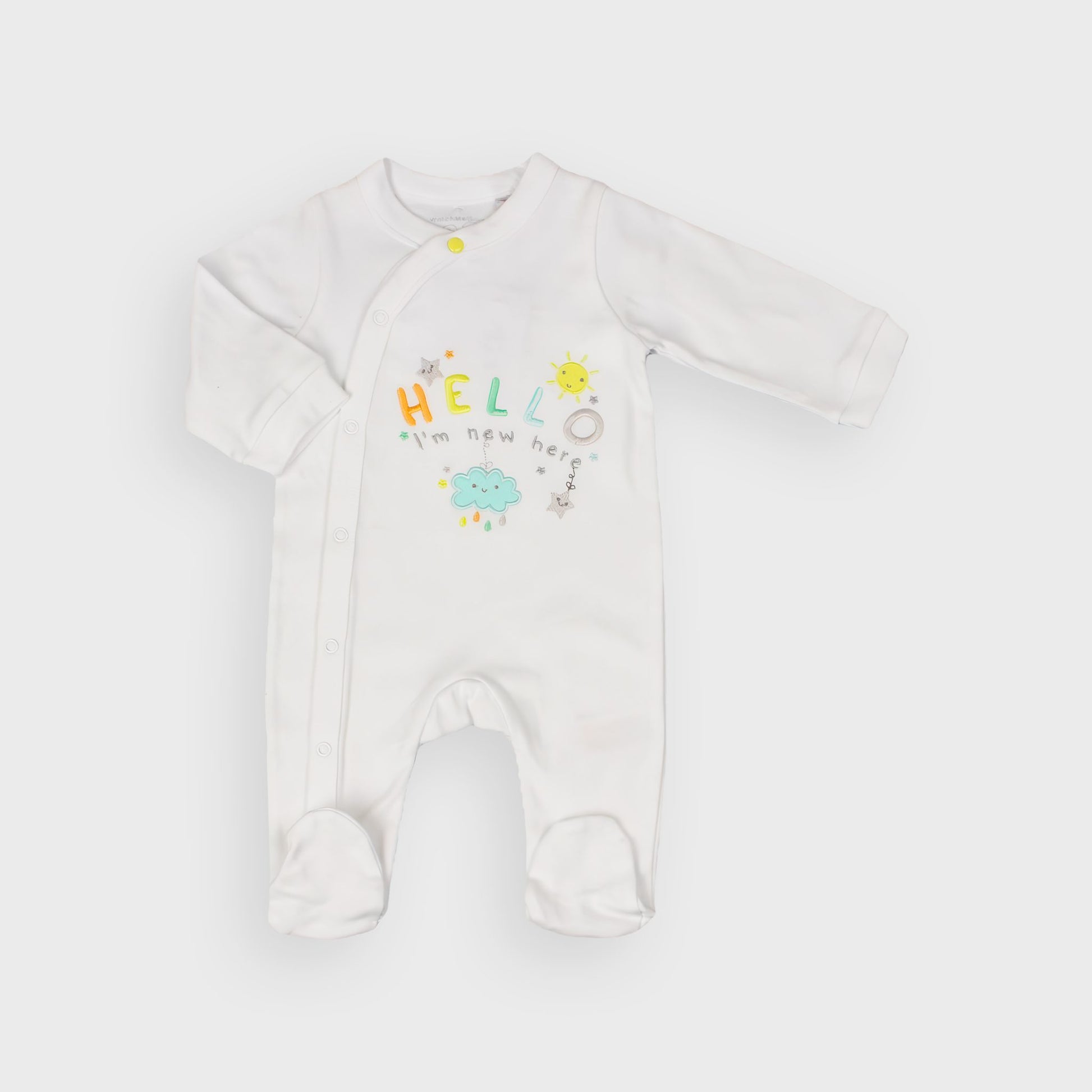 - Unisex white sleepsuit with “Hello I’m New Here” slogan