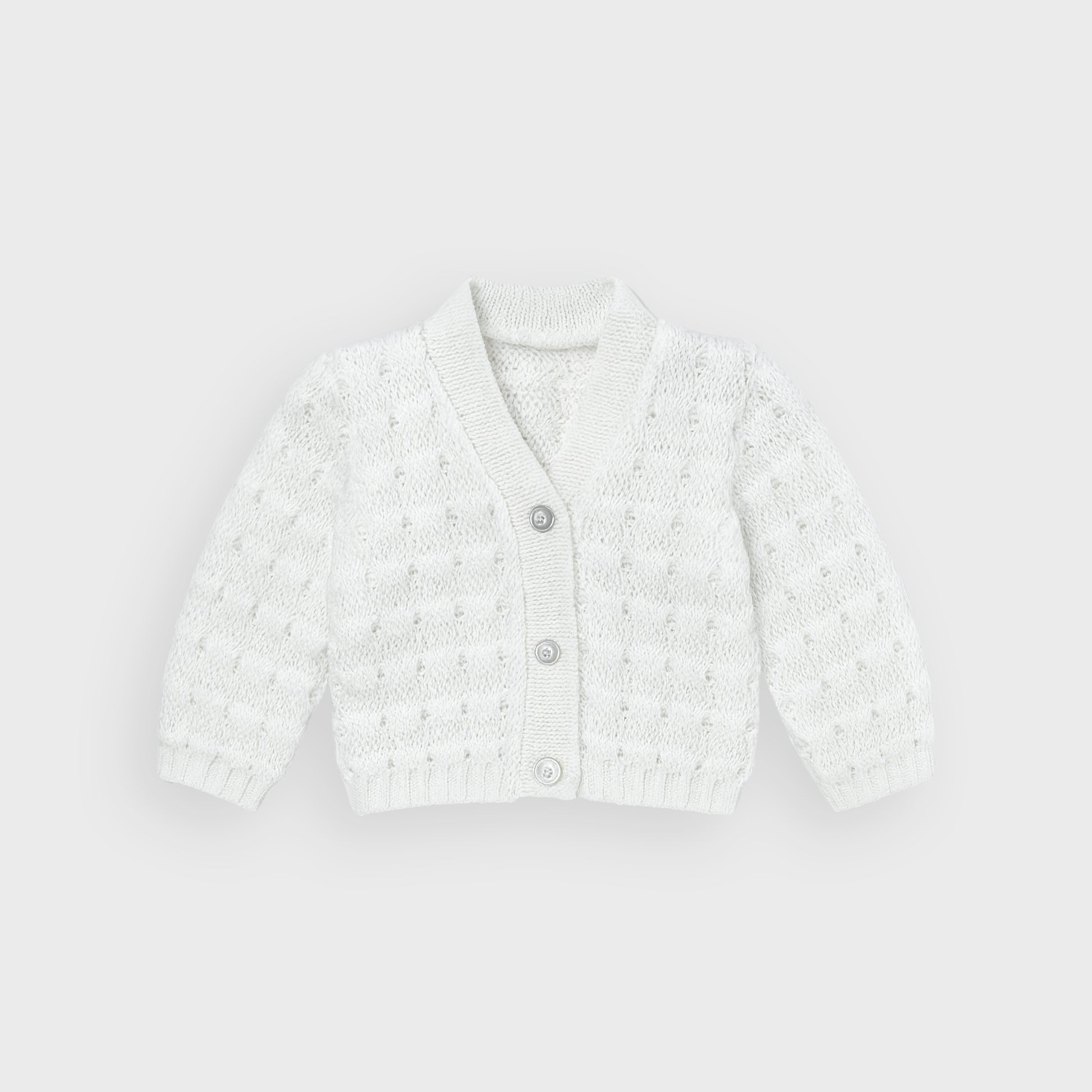 Keep them snug in timeless style with this unisex white knitted cardigan from Bee Bo. Crafted in soft, breathable, hypoallergenic acrylic, it’s gentle on delicate skin and ideal for layering over babygrows on cooler days. The bobble-knit detail adds a charming touch, while the V-neck and ribbed trims keep the fit neat and comfy for everyday wear.